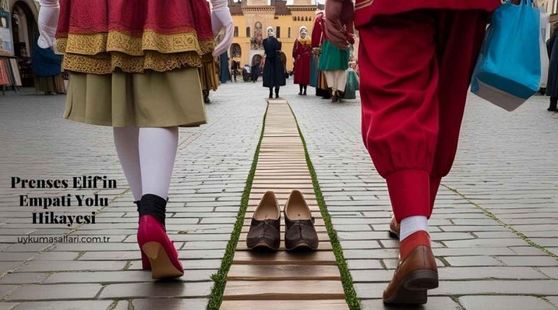 Prenses Elif, “Herkes ne hissediyor, neden öyle düşünüyor?” diye düşünmüş. O gece rüyasında bir bilge ona, “Empati Yolu inşa et; herkes yol boyunca birbirinin ayakkabısını giyip yürüsün,” demiş. Ertesi sabah kolları sıvamış. Meydanda uzun, tahta bir yol yapımına başlamış. Yolun kenarlarına iki çift ayakkabı yerleştirmiş: Biri tüccar A için, diğeri tüccar B için. Herkes sırayla bir çift ayakkabı alıp Empati Yolu’nda yürümüş; karşı tarafın bakış açısını deneyimlemiş. Tüccar A, B’nin ayakkabısını giyince elma toplamanın zorluklarını, B ise A’nın yetki sorumluluğunu anlamış. Yürüyüş sonunda birbirlerine sarılıp özür dilemişler. Halk da bu yöntemin gücünü görünce kendi aralarındaki anlaşmazlıklarda Empati Yolu’nu kullanmış.